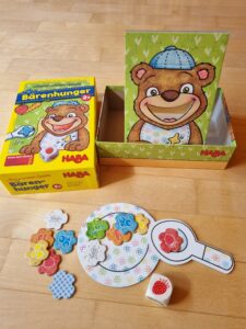 Erste Regelspiele eignen sich zur Sprachförderung ebenfalls, wie Bärenhunger von Haba. Hier wird ein Bär gefüttert. Je nachdem, was das Kind würfelt, darf es den Löffel entsprechend beladen und dem Bären in den Mund schieben. Dies erfordert gute Feinmotorik-Koordination, Regelbewusstsein und viel Sprache in der Interaktion mit Ihnen.