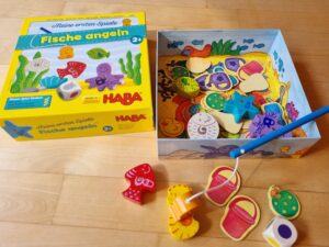 Auch Fische angeln ist eine gute Möglichkeit um über ein Regelspiel in das Sprechen zu finden. Farben werden benannt, es wird gewürfelt und Tiere, die Wasser leben können benannt werden – es geht um Kooperation, daher auch um Sprache.
